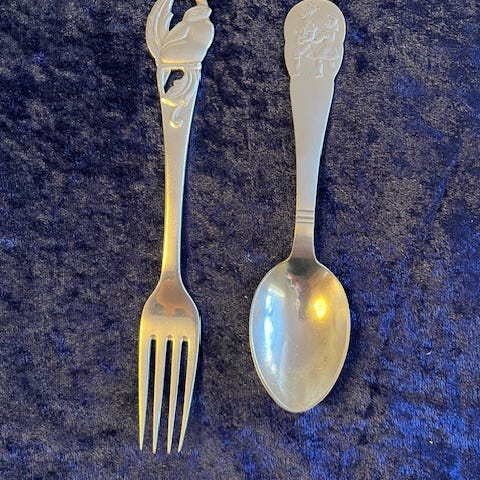 Sølvtøj, Barneske, barnegaffel, barnebestik, servietring, rangle. Dansk sølvsmed, Tretårnet og plet. Børnegaffel, børneske. Forskellige skeer og gafler i sølv. Eventyrmotiver , ole lukøje mfl. stemplet sølv tretårne og sølvplet pris pr stk fra kr 100 til kr 500. Skeen yderst tv er solgt. Kan sendes efter aftale