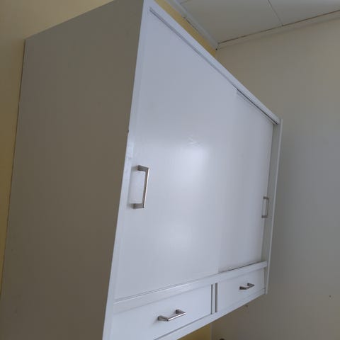 Dansk design, vægskab med 2 låger bag hvilken skuffer mm. Senere bemalet. Stand se billeder .