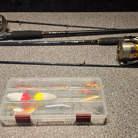 Forskelligt fisketilbehør, der sælges samlet. Nogle er helt nye, andre brugt en smule.
