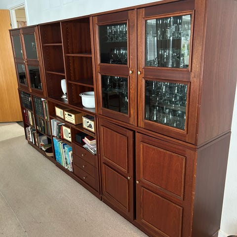 Bøstrup reol model 60, bejdset mahogni i flot håndværksmæssig kvalitet med indirekte lys foroven.