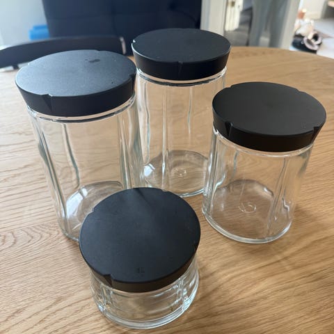 Rosendahl glasopbevaringskrukker med låg. Sættet består af to klare glasbeholdere med tilhørende glaslåg med greb. Krukkerne egner sig til opbevaring i køkkenet, for eksempel til tørvarer som mel, sukker, pasta eller snacks. De kan også anvendes til anden praktisk opbevaring i hjemmet. Designet er enkelt og gennemsigtigt, så indholdet er let at se. prisen er for begge to i alt.