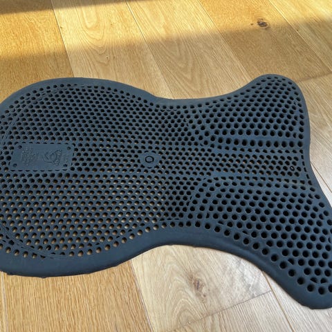 Acavallo gel pad til sadel i sort. Pad’en er fremstillet i perforeret gelmateriale, der giver stødabsorbering og skridsikkerhed mellem hest og sadel. Formen er anatomisk udskåret for at følge hestens ryg og fordele trykket jævnt. Velegnet som underlag under sadlen for ekstra komfort og stabilitet.