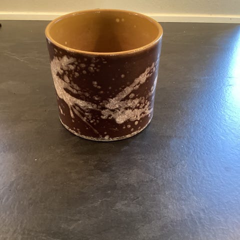 West Germany keramik urtepotteskjuler i glaseret stentøj. Skjuleren har grøn kant og turkis krop med brune lodrette felter. Undersiden er mærket "Made in W. Germany" samt form- og størrelsesnummer. Velegnet som urtepotteskjuler til indendørs planter eller som dekorativ krukke i hjemmet.