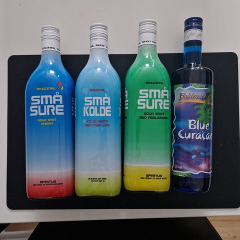 Fire energidrik på dåse. Dåserne er pakket i bakker og stablet på paller, egnet til videresalg eller større forbrug