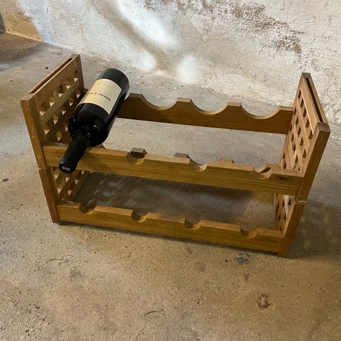Vinreol i teak med plads til 20 flasker.