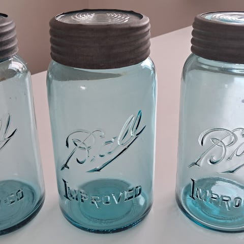 Wheaton glasflaske i blåfarvet glas. Flasken er ca. 18 cm høj og har oval form med indgraveret motiv og teksten “The Father of His Country”. Og Washington.