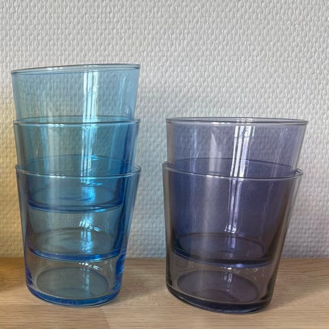 IKEA drikkeglas i blåfarvet glas. Sættet består af stablebare glas med facetteret form. 35cl. Ingen skår.