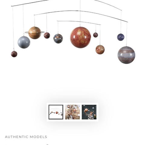Uroen består af 9 ophæng fordelt på 3 tynde metal stænger, som viser Jorden, Pluto, Uranus, Saturn, Mars, Solen, Mercur, Venus, Jupiter samt Neptuns placering, i forhold til hinanden.
