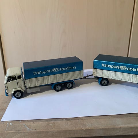 Tekno Volvo F88 ASG lastbil med anhænger legetøjsmodel blå/gul