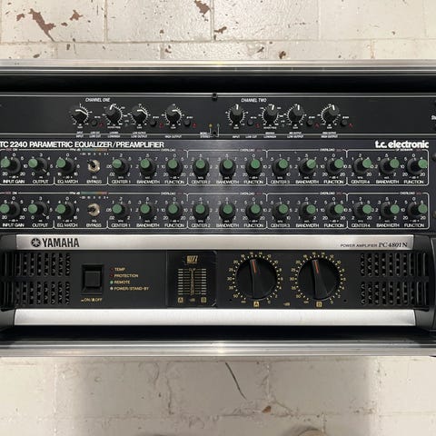 Behringer Europower effektforstærker er monteret i et transportabelt rack sammen med dbx delefilter Bagpanelet viser tilslutninger til strøm, højtalere og signal, egnet til professionel eller semiprofessionel brug, hvor der er behov for stabil effektforstærkning til PA-højttalere.