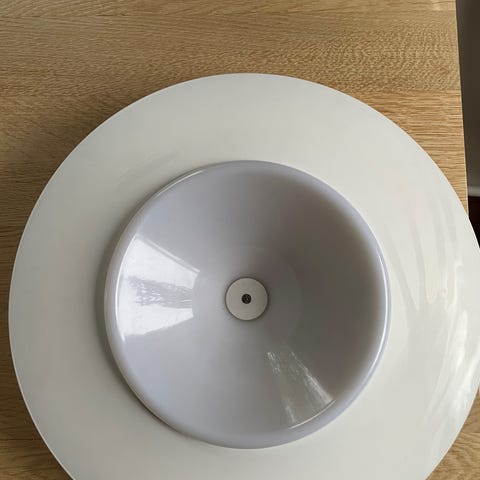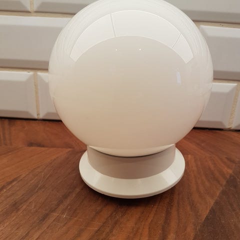 Hvid lampe med glaskuppel og plastikkrans. Fra 1950erne.