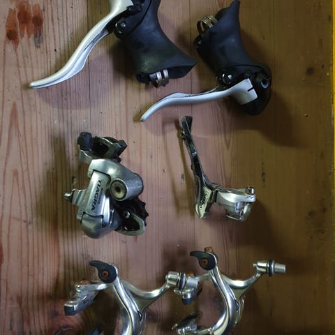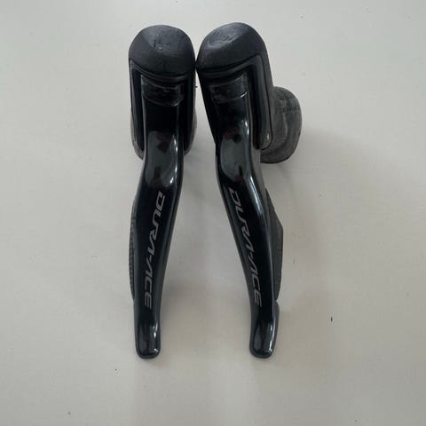 Shimano Tiagra STI skifte- og bremsegreb i sort til racercykel. Sættet består af et højre og et venstre greb, der kombinerer gearskift og fælgbremsebetjening i samme enhed. Delene er brugte, men fungerer ubeklageligt.
