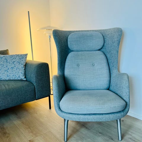 Sælger vores Fritz Hansen RO lænestol i en flot grå nuance.