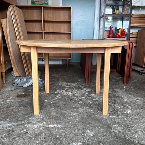 Kurt Østervig spisebord i massiv sæbebehandlet egetræ, og 4 ekstraplader i fíneret egetræ. Spisebordet er produceret hos KP Jørgensens Møbelfabrik, og 2 støtteben medfølger som bør benyttes afhængigt af hvor mange tillægsplader der benyttes. Bordet er ovalt, og de 4 ekstra plader giver en totallængde op til 359 cm.