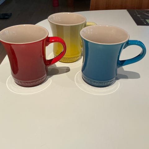 Le Creuset espresso kopper i blå stentøj. Krusene har glaseret yderside i blå og lys inderside.