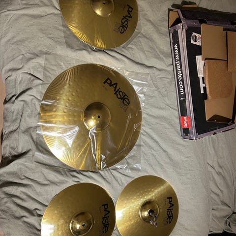 Paiste PST5 bækkensæt med 14" medium hi-hat (bottom vist på billedet), 16" crash og 20" ride bækken.