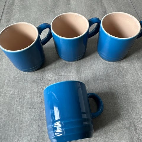 Le Creuset espresso kopper med underkopper i rød stentøj. Sættet består af to kopper og to matchende underkopper med Le Creuset-logo på kanten. Kopperne har lys inderside og rød yderside.