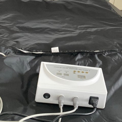 Beauty Instrument 2 Parts Far Infrared Sauna Blanket. Elektrisk saunatæppe med to sektioner og fjern infrarød varme. Tæppet tilsluttes 220V og har en effekt på 650W. Kontrolenheden giver mulighed for at indstille temperatur og tid. Farve: grå. Velegnet til brug derhjemme til afslapning og opvarmning af kroppen, hvor man ligger inde i tæppet under brug.