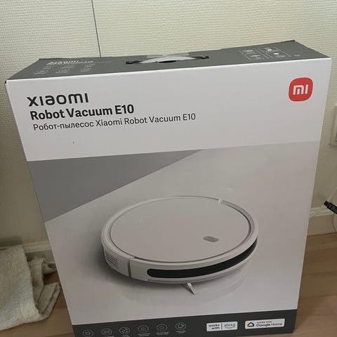 Xiaomi robotstøvsuger i hvid med aftageligt mariehøne-design på toppen. Enheden har rund form, topklap til adgang til støvbeholder samt betjeningsknapper på oversiden. Undersiden er udstyret med hovedbørste, sidebørste og hjul til kørsel på hårde gulve og tæpper. Medfølgende ladestation ses på billederne. Velegnet til automatisk støvsugning i hjemmet.