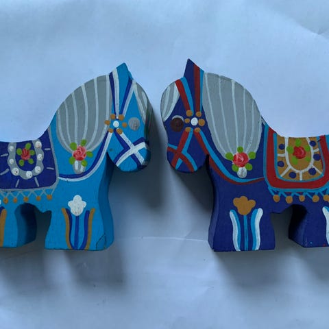 Way Nor træheste håndmalede figurer i rødmalet træ. Sættet består af tre heste i forskellige størrelser med dekoreret blomstermotiv på siderne. Hestene er håndlavet i Norge, som angivet på metalpladen under bunden. Velegnet som dekoration eller samlerobjekt.