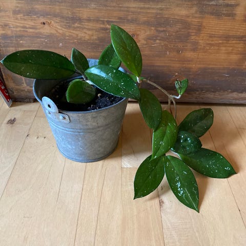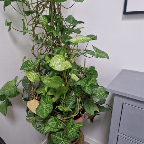 Guldranke potteplante med grønne, hjerteformede blade. Planten er opbundet på en mosstok. Leveres i potten, der dog ikke er egnet til planter oprindeligt, så man skal nok have en anden.