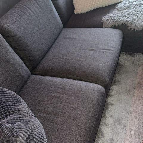Sofa, der er ca. 4 år gammel, kan afhentes gratis. Sofaen buer på midten, da benene har været monteret forkert. Indeholder en chaiselong, der intet fejler. Står i meget pæn stand. For en gør-det-selv-type kan den med garanti blive stabil igen.