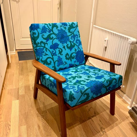 Teak lænestol som er i god stand bortset fra sædet.