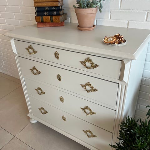 Lille vintage kommode sat i stand mat creme/råhvid farvet maling og små perlemors mosaikker. Den er i god stand, men brugt. Kan fornyes med maling ønsker man ikke det gamle/antikke udtryk.