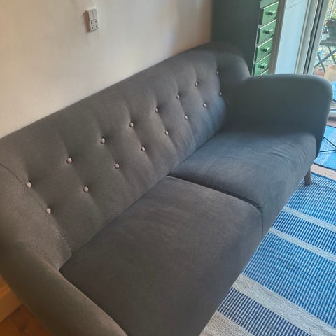 Sofaen egner sig til stue eller opholdsrum og giver siddeplads til cirka tre personer. Den neutrale grå farve gør den let at kombinere med forskellige typer indretning og tekstiler.
