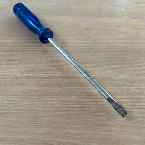 Skruetrækker med flad kærv og rød plastgreb. Skaftet er i metal, og håndtaget er formet for bedre greb. Velegnet til skruer med lige kærv i mindre gør-det-selv- og reparationsopgaver i hjemmet eller værkstedet. 24 cm langt. Kærv 6 mm.