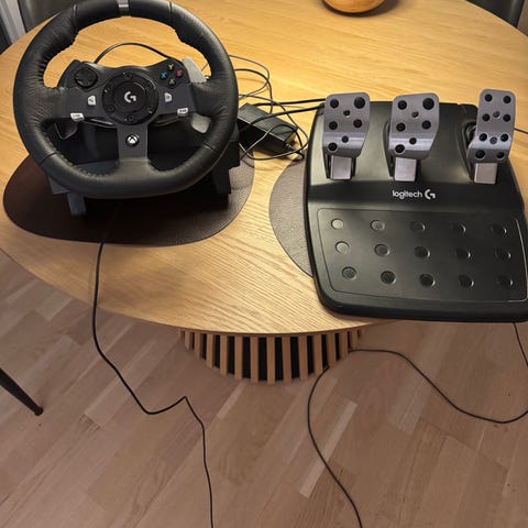Logitech rat og pedaler til gaming. Sættet består af et rat med monteringsbeslag til bord samt tilhørende pedal-enhed med to pedaler. Tilslutning via USB-kabel. Egnet til brug med kompatible computere eller spillekonsoller, afhængigt af model og drivere. Sort plastkonstruktion med integrerede knapper på rattet og skridsikre gummifødder på pedalbasen.