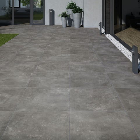 Element flise i størrelsen 60x60 cm i grå farve. Kvadratisk keramisk/stenlignende flise egnet til fx gulv eller væg i rum som badeværelse, køkken eller entré. Kan også bruges ude