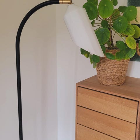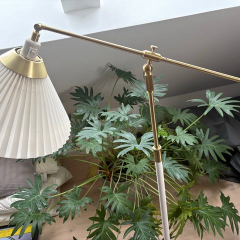 Le Klint gulvlampe designet af Aage Petersen. Lampen har en plisseret, hvid skærm og stel i messingfarvet metal. Armen er justerbar, så lysretningen kan tilpasses efter behov. Gulvlampen er egnet som læselampe eller stemningsbelysning i stue, kontor eller soveværelse. Klassisk Le Klint plisseskærm, der giver et blødt og behageligt lys.