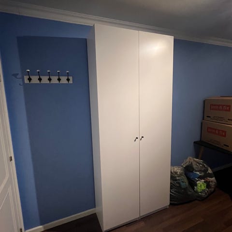 Grundet fraflytning, sælger vi vores 4x hvide IKEA PAX skabe/reoler, med alt indhold som vist på billederne: hylder, skuffer, bøjlestænger og kurve i bunden.