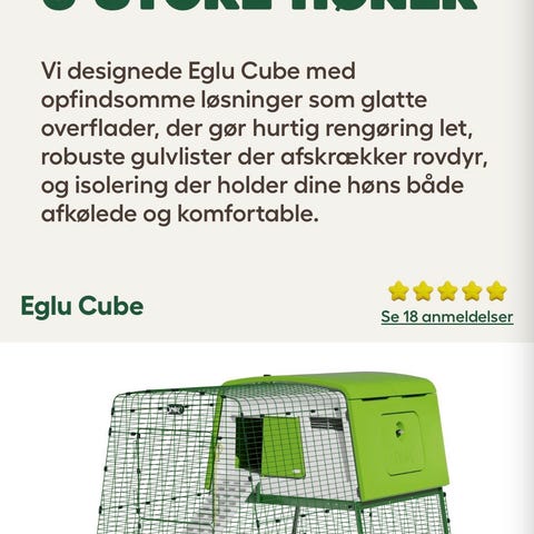 Omlet Eglu Cube hønsehus i grøn plast. Huset har glatte overflader og et udtageligt gulv, der gør rengøring enkel. Konstruktionen er i robust plast med ventilationsåbninger og isolerede vægge. Indvendigt er der plastgulv med tremmer over strøelsen, hvor hønsene kan gå, samt plads til redekasse og æglægning. Eglu Cube er velegnet til udendørs hold af høns i have eller mindre hobbybesætning og kan kombineres med hønsegård eller indhegning efter behov.