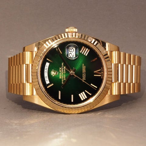 Rolex Day-Date 40 WG, ref. 228239, med olivengrøn skive, oprindeligt solgt i oktober 2023.