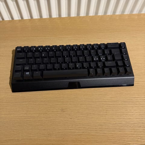 Razer håndledsstøtte til tastatur i sort. Rektangulær model med Razer-logo på oversiden og flere gummifødder på undersiden for stabil placering på bordet. Designet til at give støtte til håndleddene ved brug af tastatur, velegnet til skrivebordsopsætninger og gaming. Farve: sort.i fin stand 45 cm lang
