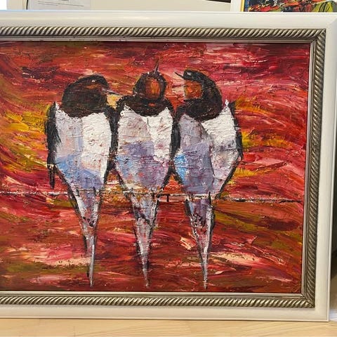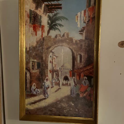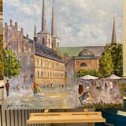 Maleri med motiv af en domkirke og omkringliggende bygninger, udført i dæmpede farver med grønne og hvide nuancer. Billedet er indrammet i en enkel sort ramme, der markerer motivet tydeligt på væggen. Egnet som vægkunst i stue, kontor eller andre opholdsrum, hvor der ønskes et arkitektonisk og roligt motiv.