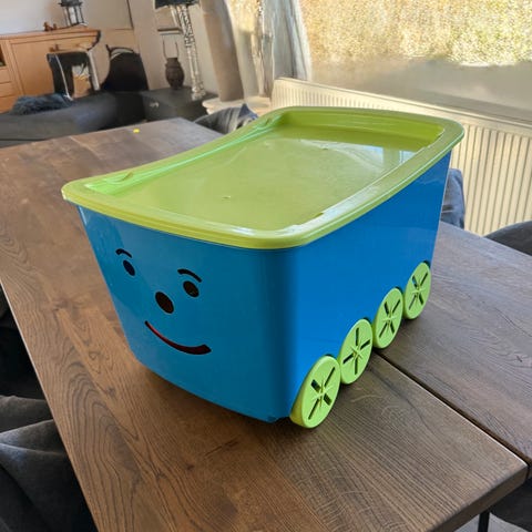 IKEA SMÅSTAD legekasse og skuffe i hvid. Rektangulær opbevaringskasse med låg og integrerede håndtag i siderne, egnet til opbevaring af legetøj eller andet udstyr.