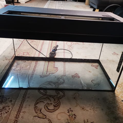 Fiskeakvarie: Længe ca 50cm, højde ca 35cm, bredde ca. 30cm, samt pumpe, akvarie renser og dekoration. Akvariet er renset og klar til brug.