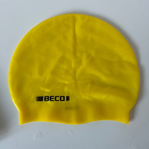 bathing cap, swim cap, sort/pink mønstret, svømning, one size voksen, silikone, brugt få gange, vejer 52 gram.