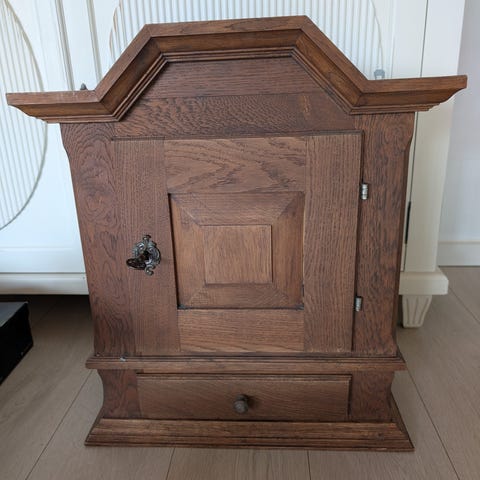 Lille vægskab i fyrretræ med skuffe, 1 hylde og glaslåge i god stand. Lige til at hænge op. Kan evt. males.