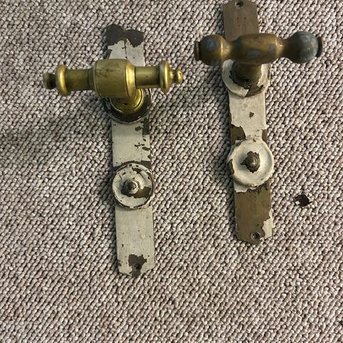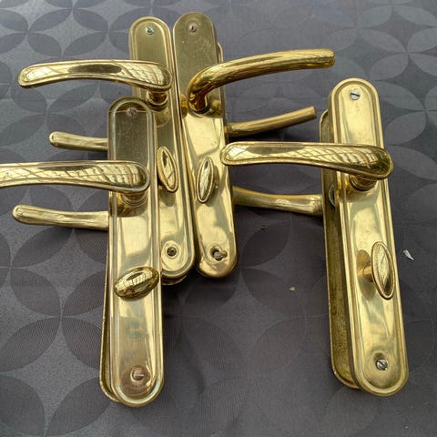 Sæt med ældre dørgreb i metal, herunder flere greb i messinglook. Velegnet til indvendige døre eller som reservedele til renovering af ældre beslag. Klassiske former med gennemgående firkantpind til montering i dør. Sælges samlet som på billederne. Kr. 3 sæt 350,00