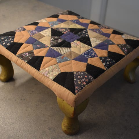 Gammel fodskammel i træ m. broderet pude