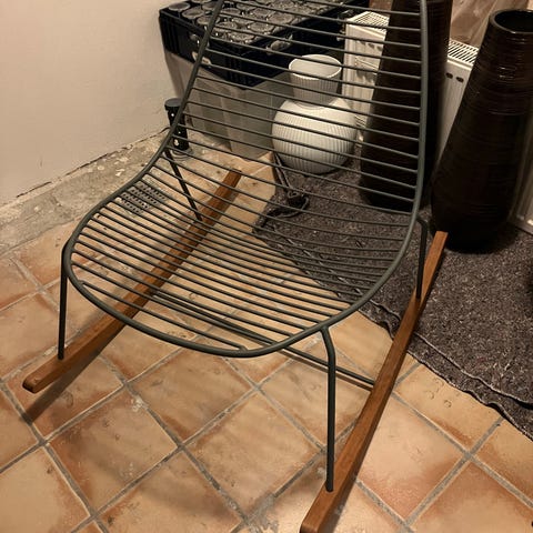 ILVA string gyngestol, også kendt som en lounge gyngestol, der er fremstillet af gråmalet stål med meder af træ. Der er smule slid pga. det skind som der er brugt.