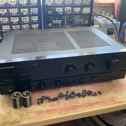 Pioneer A-335 forstærker fra 1989. Fungerer fint. Ingen knas og skrat fra knapperne. Mål, B: 42. H: 12,5. D: 35. Vægt: 7 kg. Kan sendes med Dao. Modtager betaler.