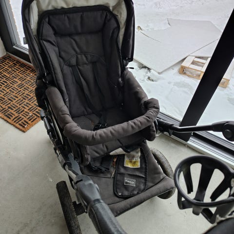 Meget velholdt klapvogn med aluminiums stel og brede gummihjul. Dermed medfølger original vinterkørepose.