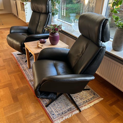 2 stk Hjort Knudsen lænestole (elektrisk) med 1 skammel og 2 borde i fin stand. Købt i 2016, kvittering haves. Ny pris