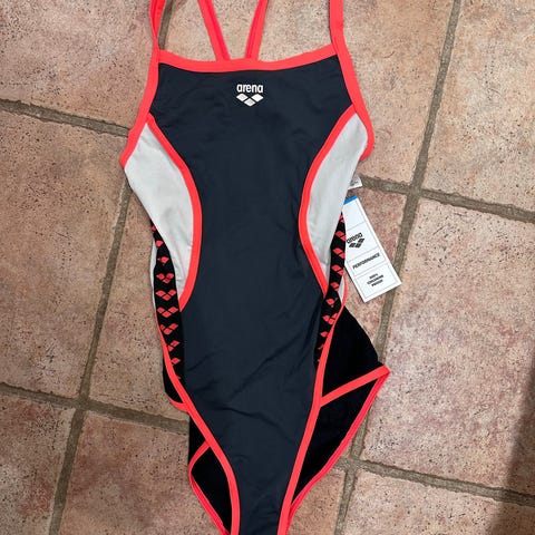 Arena badedragt til svømning for kvinder i størrelse 46. Badedragten har et flerfarvet grafisk mønster i blå og sorte nuancer på ydersiden og en pink inderside på ryggen. Modellen har tynde, krydsede stropper og åben ryg, som giver god bevægelsesfrihed i vandet. Velegnet til svømmetræning og generel brug i svømmehal eller ved strand.