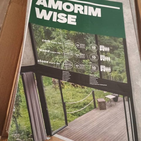 15 m2 lækkert lyst korkgulv, nyt i original uåbnet emballage (1 pk. åbnet fot foto). Special rengørings/pleje middel medfølger. Dejligt at gå på og lyddæmpende.